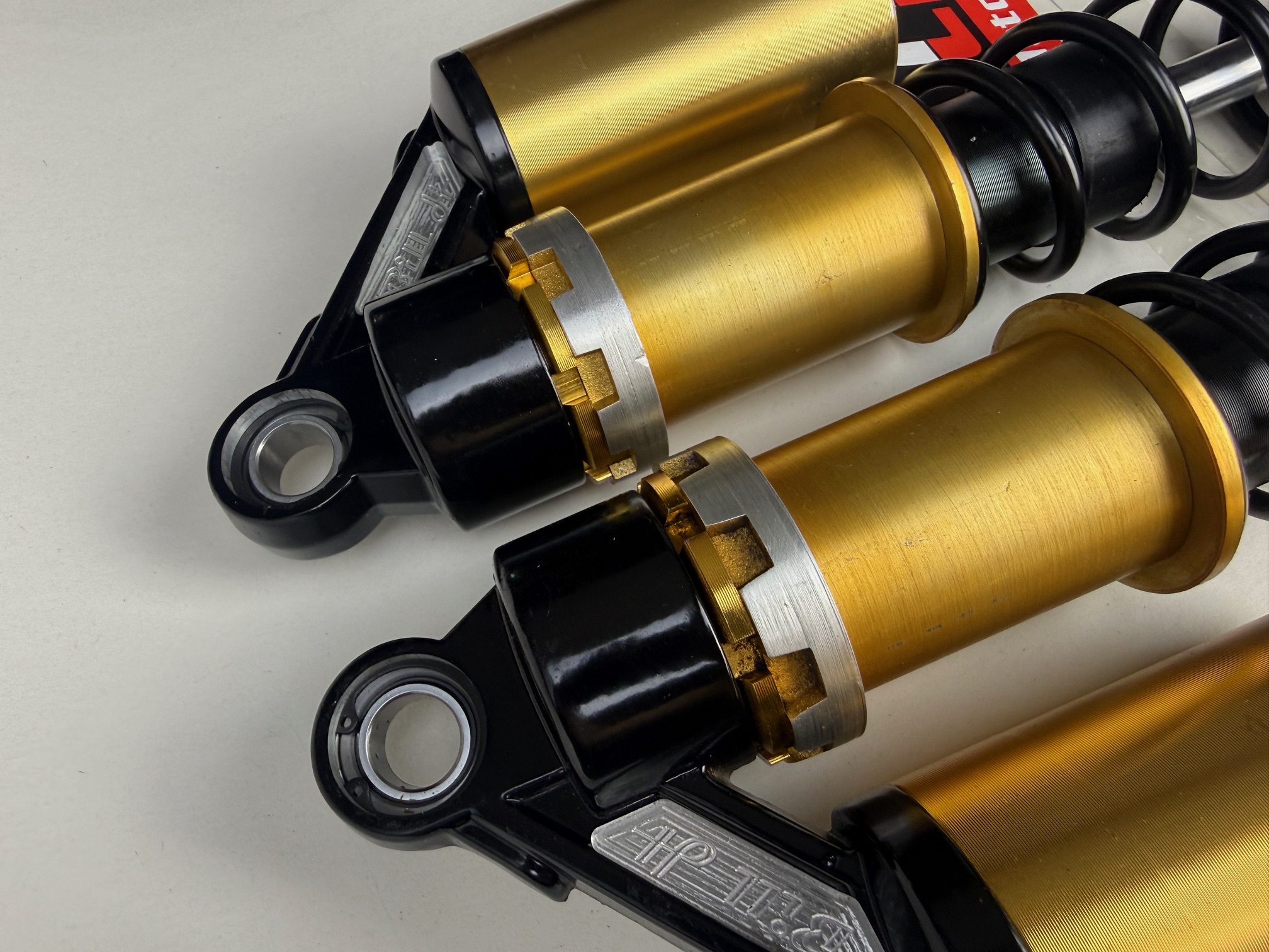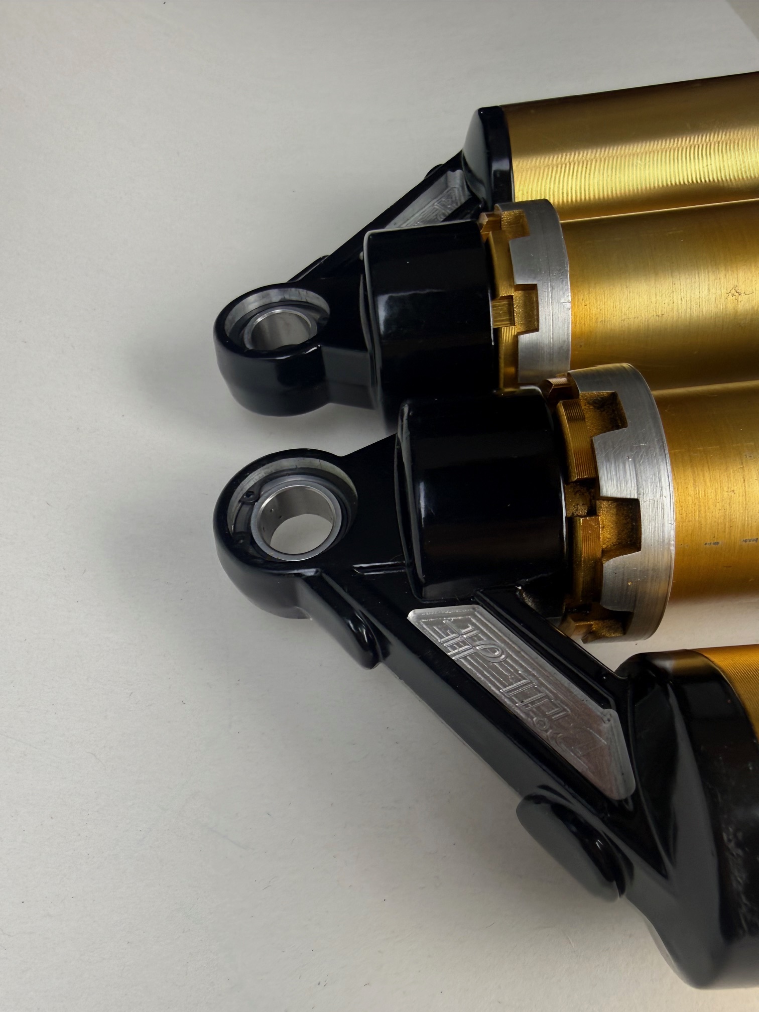 To complete this build I machine custom perches to adapt a commonly available small form factor spring, fitting a 70lbs/inch coil. Multiple rate options in this size range are available. For top and bottom mounts, the dampers were machined for spherical bearings. A complete rebuild of the damper was performed with a proprietary honing system used for the interior bore to provide optimum conditions for the piston seal. For the machined parts, in house gold anodize was applied to match the existing accent pieces. Where the close fitting coil nears the shock body, a 3D printed chafe guard was designed and added.